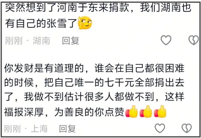某种程度上,张雪挺冲动的,他觉得反正几千块不够自己走出低谷,不如给需要的人,也许能救对方一命,非常朴素的善恶观,但不具备普遍性,毕竟大家都是普通人,做慈善都要量力而为,评论区还有网友觉得,张雪之所以能成功,就是因为太善了。