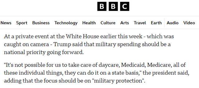 这一变化,在特朗普近日一次闭门活动中的表态中也体现得十分直白。多家媒体披露,特朗普当时称,美国“正在打仗”,联邦政府“不可能负责托儿所、医保、医疗补助以及所有这些具体的事情”,这些事务可以交由各州处理;相较之下,未来国家更应优先考虑的,是“军事保护”。