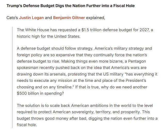 美国智库卡托研究所分析人士指出,国防预算本应服务于国家战略,而不是因美国战略和外交目标过度扩张,被不断推高。而这份预算不是在解决问题,而是让“国家进一步陷入财政深坑”。