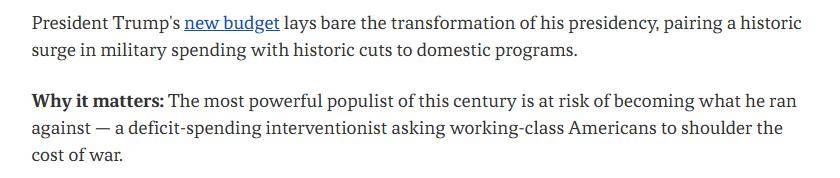 评论直言,这份预算建议“暴露了总统这一任期的转变”: 这位靠选民动员崛起的政治人物,正越来越像自己当年批评过的那类华盛顿政客——靠赤字维持扩张,以对外干预和军费膨胀运转,把战争代价转嫁给普通美国人。
